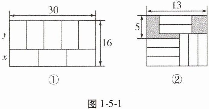 如图 1-5-1①, 第一小组领了 8 个大小、形状完全相同的小长方形, 拼成一个大长方形, 每个小长方形的长和宽分别为 $ y $, $ x $($ y > x $), 小组同学测得拼成的大长方形的长为 30, 宽为 16, 可得方程组 $ \begin{cases} 5x = 30, \\ x + y = 16, \end{cases} $ 则 $ x = $______, $ y = $______。