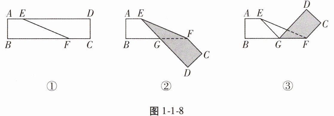 7. 图 1 - 1 - 8①是长方形纸带,∠DEF = 23°,将纸带沿 EF 折叠成图 1 - 1 - 8②,再沿 BF 折叠成图 1 - 1 - 8③,则图 1 - 1 - 8③中的∠CFE 的度数是