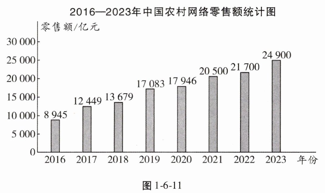 2. (2024·甘肃中考)近年来, 我国重视农村电子商务的发展。下面的统计图反映了2016—2023年中国农村网络零售额情况。根据统计图提供的信息, 下列结论错误的是 ( )
