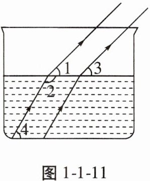 11. 光线在不同介质中的传播速度是不同的,因此光线从水中射向空气时要发生折射。由于折射率相同,所以在水中平行的光线折射到空气中也是平行的。如图 1 - 1 - 11,若∠2 - ∠1 = 75°,则∠3 与∠4 的度数和是____。
