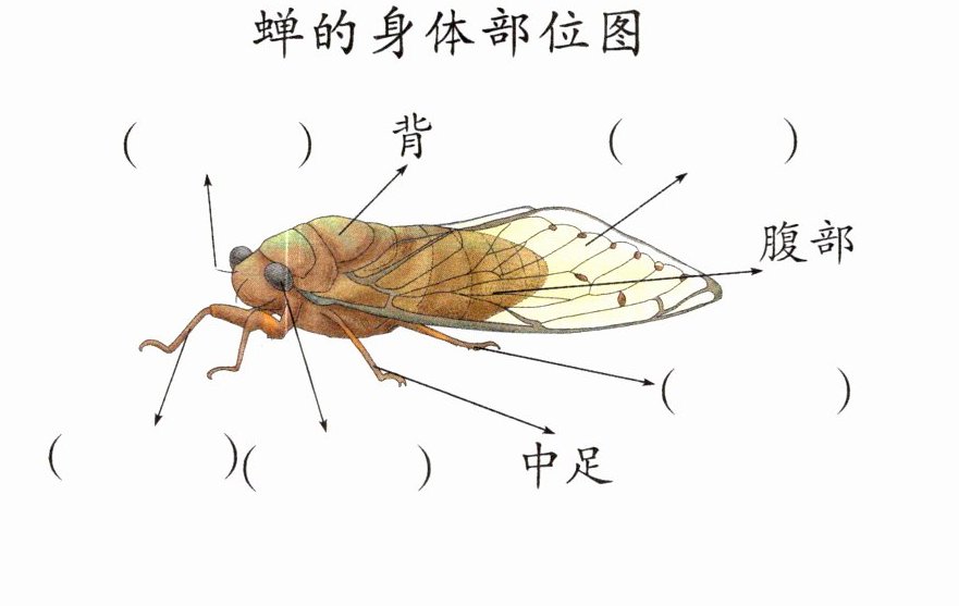 快和爸爸妈妈一起去公园,到树下、草丛里、花坛旁等地方找一找蝉,仔细观察蝉,完成“蝉的身体部位图”吧。