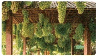 收下来的葡萄,有的运到城市去,有的运到晾房里制成葡萄干。晾房修在山坡上,四面墙上有许多小孔,里面钉着许多木架子。成串的葡萄挂在架子上,利用流动的热空气,让水分蒸发①掉,就成了葡萄干。这里生产的葡萄干颜色鲜,味道甜,非常有名。