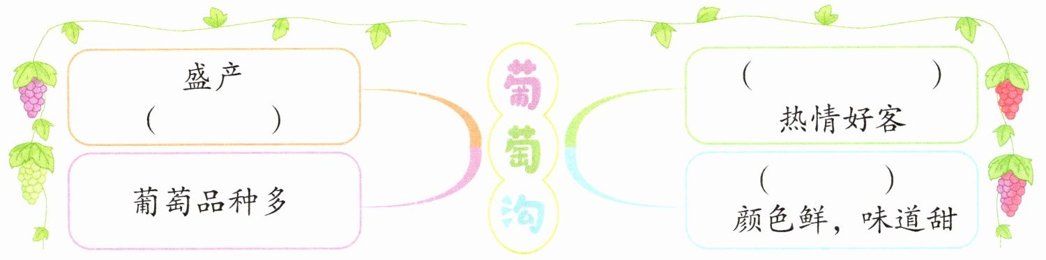 新疆吐鲁番有个地方叫葡萄沟,那里盛产水果。五月有桑葚,六月有杏子、无花果,到了七月份,人们最喜爱的葡萄成熟了。