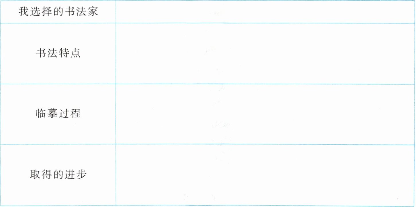【解析】:本题主要考查对书法家的了解以及书法临摹的能力。需要先选择一位书法家,分析其书法特点,然后进行临摹并记录成果和进步。这涉及到对书法知识的积累、观察力以及书写实践能力。