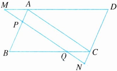 四边形 MACQ 与四边形 ACNP 都是平行四边形,证$\triangle AMP\cong\triangle CQN$,得 MP=NQ.