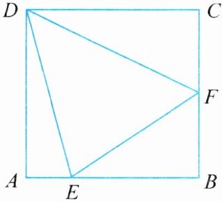 提示:延长 EA 至 H,使 AH=CF,连接 DH,$\triangle DAH\cong\triangle DCF$,$\angle FDC=\angle HDA$,DH=DF,再证$\triangle DHE\cong\triangle DFE$,得$\angle HDE=\angle EDF$,$\therefore\angle HDA+\angle ADE=\angle EDF$,$\angle ADE+\angle FDC=\angle EDF$,$\angle ADE+\angle FDC+\angle EDF=90^\circ$,$\therefore 2\angle EDF=90^\circ$,$\angle EDF=45^\circ$.