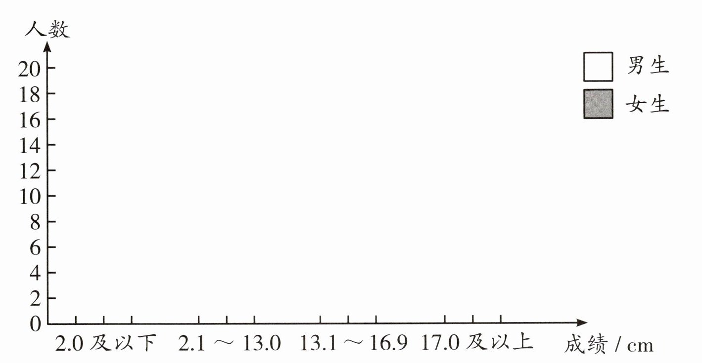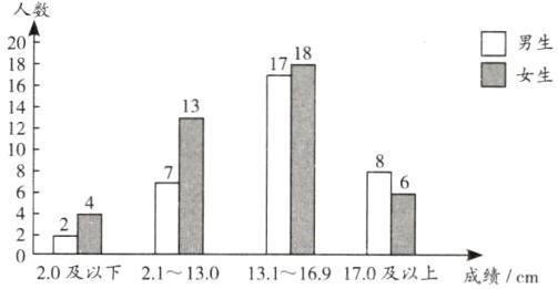 (3)女生成绩在2.0cm及以下为不及格,那么女生不及格的有( )人。男生成绩在13.6cm及以上为优秀,成绩在13.1cm~13.5cm的有15人,男生中成绩优秀的有( )人。