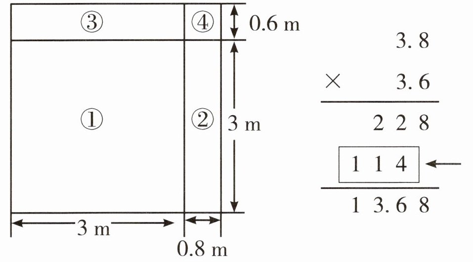 (3) 一个长方形指示牌长3.8m,宽3.6m,小丽用竖式计算出指示牌的面积。如果对照指示牌示意图(如下图),竖式中箭头所指的数计算的是(