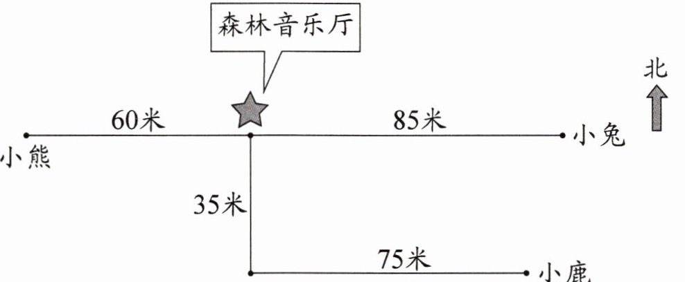 1. 小兔:向西走85米;小熊:向东走60米;小鹿:先向西走75米,再向北走35米。2. 25 3. 孔雀家在森林音乐厅的西南方向。图略