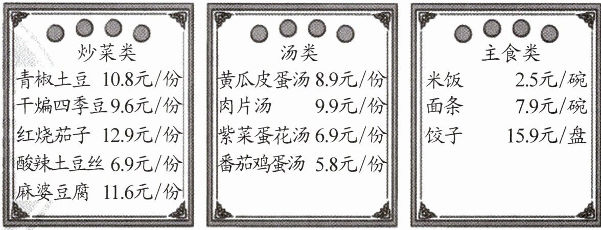 下面是一家饭店的菜单。小明和妈妈去吃饭,两个人只带了50元,而且炒菜类、汤类和主食类都要点,他们应该怎样吃?