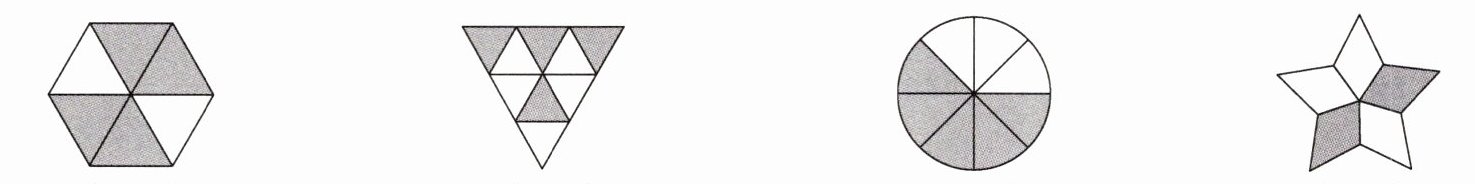 第一个图形:整个正六边形被平均分成$6$份,涂色部分占$1$份。