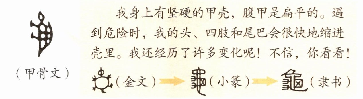 我身上有坚硬的甲壳,腹甲是扁平的。遇到危险时,我的头、四肢和尾巴会很快地缩进壳里。我还经历了许多变化呢!不信,你看看!