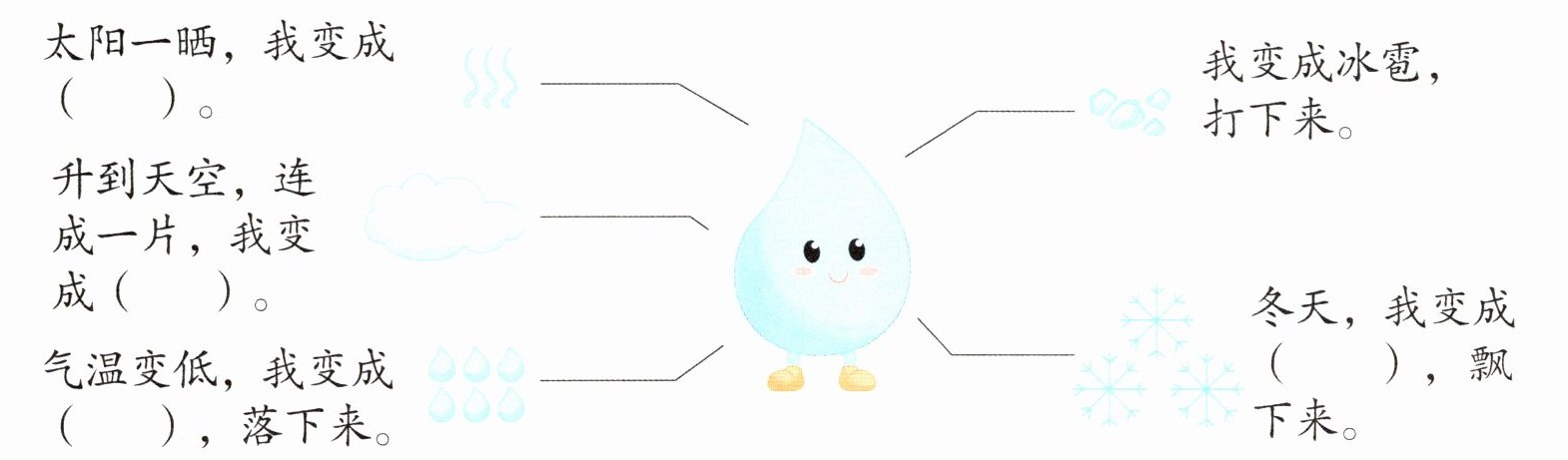 我在空中越升越高,体温越来越低,变成了无数小水滴。小水滴聚在一起落下来,人们叫我“雨”。有时候我变成小硬球打下来,人们就叫我“冰雹”。到了冬天,我变成小花朵飘下来,人们又叫我“雪”。