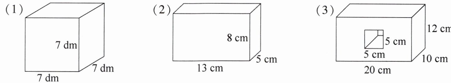 (1)$7×7×7=343$(立方分米)(2)$13×5×8=520$(立方厘米)(3)$20×10×12-5×5×10=2150$(立方厘米)