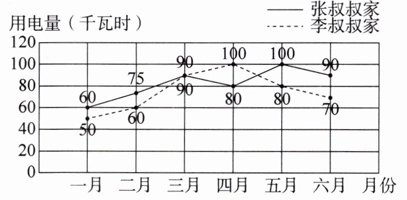 3. 下图是张叔叔家和李叔叔家去年上半年的用电情况统计图。