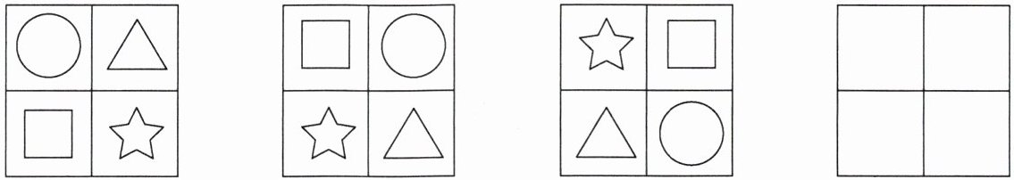 左上画三角,右上画五角星,左下画圆,右下画正方形。