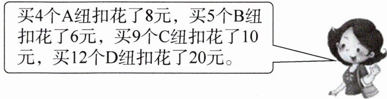 买 4 个 A 纽扣花了 8 元,买 5 个 B 纽扣花了 6 元,买 9 个 C 纽扣花了 10 元,买 12 个 D 纽扣花了 20 元。