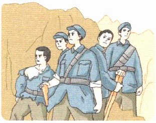 五位壮士屹立在狼牙山顶峰,眺望⑤着群众和部队主力远去的方向。他们回头望望还在向上爬的敌人,脸上露出胜利的喜悦。班长