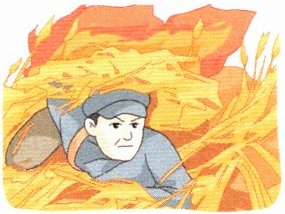 忽然,一阵浓重的棉布焦味钻进我的鼻子,我扭头一看,哎呀!火烧到了邱少云身上!他的棉衣已经烧着了,浑身火苗乱窜,看样子是溅上了燃烧弹的油液。趁着风势,一团烈火把他整个包围了。