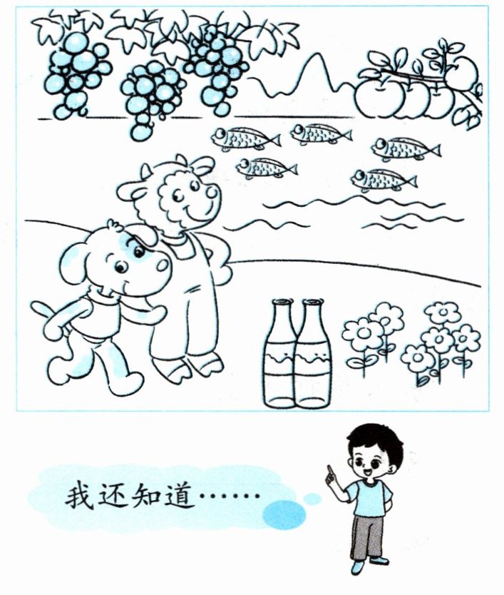一串葡萄、一个苹果(或一堆苹果)、一条鱼、一头牛、一只小狗、一个瓶子、一朵花。