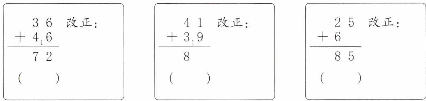 3. 找出下面各竖式错误的原因,把序号填在括号里并改正。