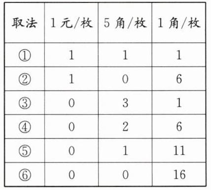 2. 程程的存钱罐里有1角、5角和1元的硬币若干枚(数量足够多),程程要取出1元6角,有多少种不同的取法?