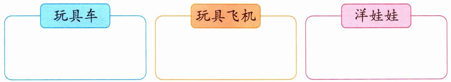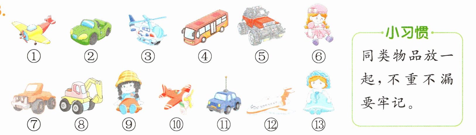 玩具车:②④⑤⑦⑧⑪;玩具飞机:①③⑩⑫;洋娃娃:⑥⑨⑬
