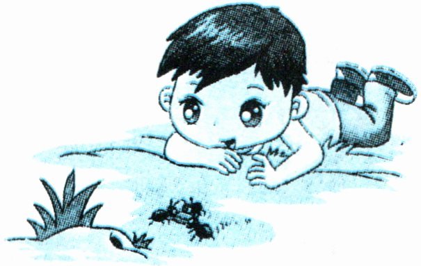 图中的小孩子在趴在地上观察蚂蚁。我看到小孩子睁着大大的眼睛,专注地看着蚂蚁,蚂蚁们排着队好像在搬运东西。我想到蚂蚁虽小,但是它们很团结,一起努力搬运食物,我们也要学习它们这种团结协作的精神。