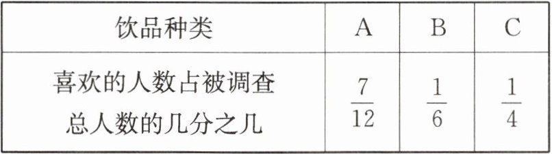 理由:$\frac {1}{6}=\frac {2}{12},\frac {1}{4}=\frac {3}{12},\frac {7}{12}>\frac {3}{12}>\frac {2}{12}$,即$\frac {7}{12}>\frac {1}{4}>\frac {1}{6}$,说明喜欢 A 饮品的人数占比最大,所以我会选择推广 A 饮品。(理由合理即可)