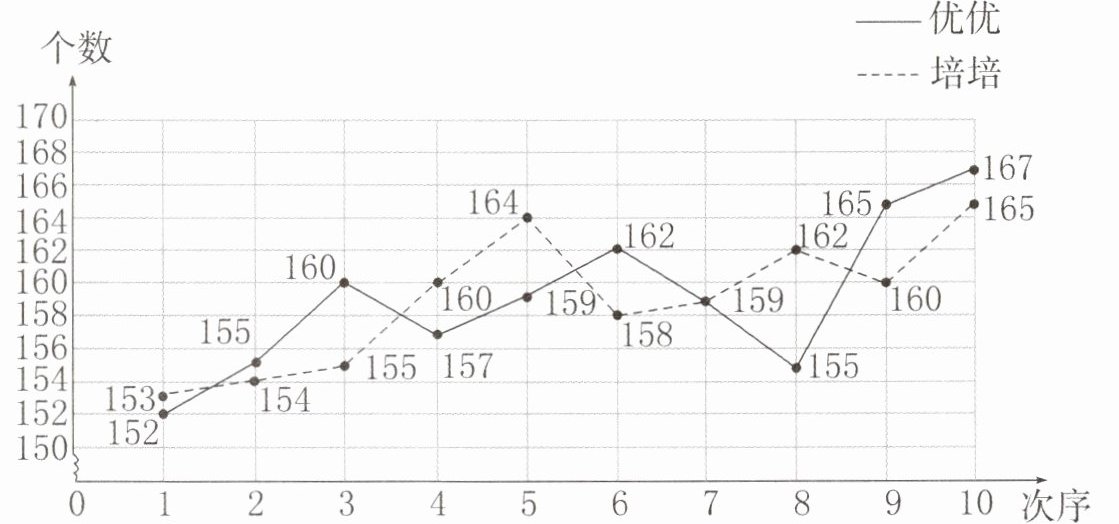 (3)答案不唯一,示例:我会选择优优。理由:优优 10 次中有 5 次踢的个数比培培多,1 次踢的个数相同,4 次踢的个数比培培少,所以我会选择优优代表学校参加比赛。