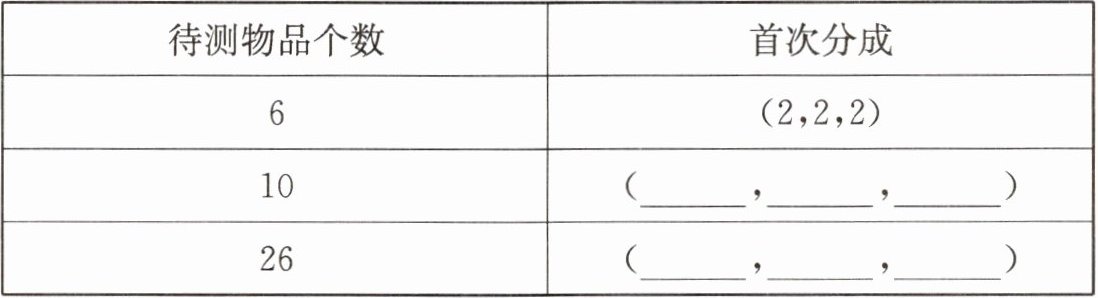 (1)请你把下面物品分一分,用尽可能少的次数找出次品。