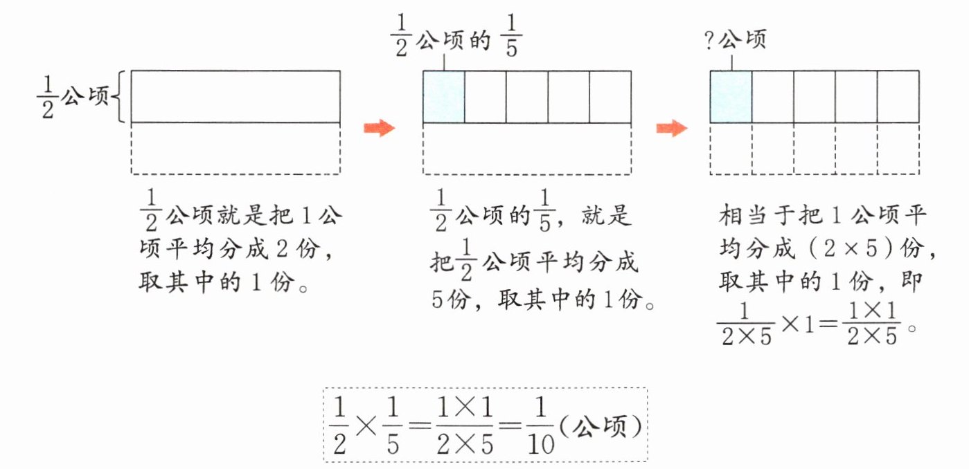 一块地的面积是$\frac{1}{2}$公顷,这块地的$\frac{1}{5}$种土豆,是把这块地的面积看作单位“1”。求种土豆的面积,是求$\frac{1}{2}公顷的\frac{1}{5}$是多少,用乘法计算,列式为$\frac{1}{2}×\frac{1}{5}$。