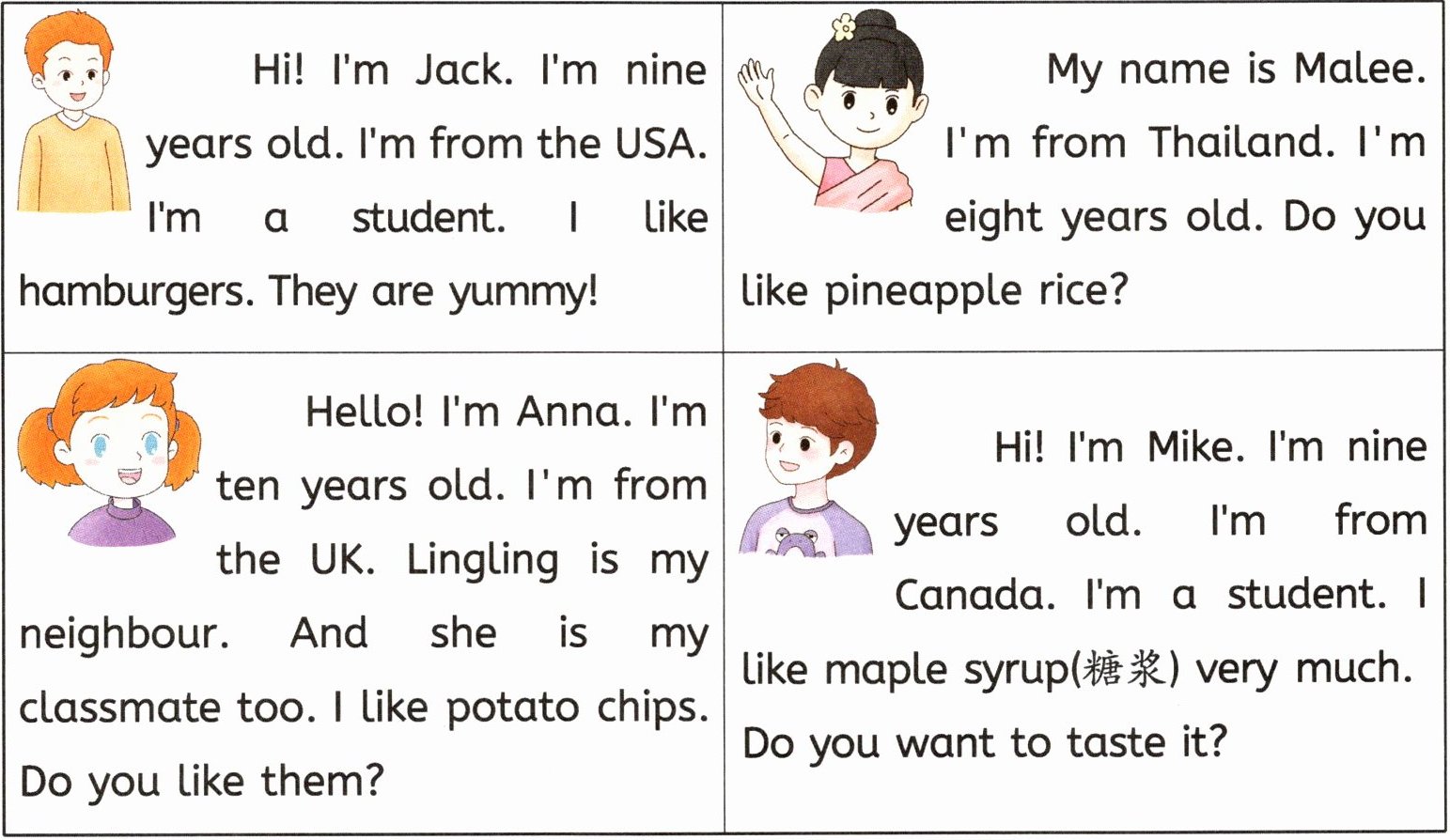 Nihao! I'm Lingling. I'm ten years old. I am a student. Welcome to China! I like Chinese hot pot(火锅). I have four new friends. What food do they like? Let's read the poster.