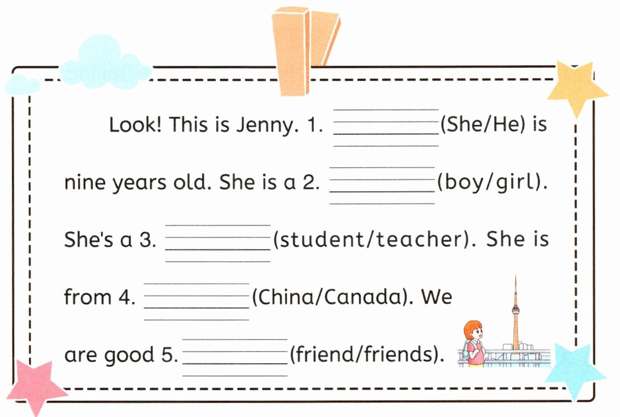 五、活动课上,小本正在制作好朋友的信息卡。 根据图片和短文提示,选出正确的单词。