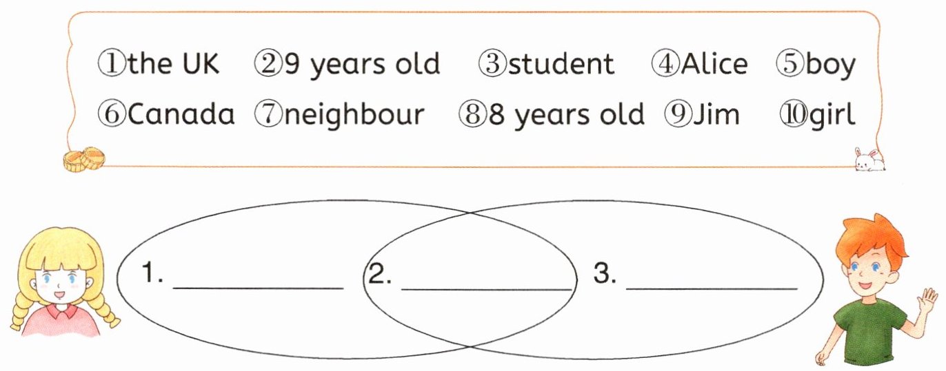 Hello! I'm Alice. I'm a girl. I'm 8 years old. I'm from Canada. I'm a student. This is my classmate, Jim. He's a boy. He's 9 years old. He's from the UK. He's my neighbour. We like to play together.