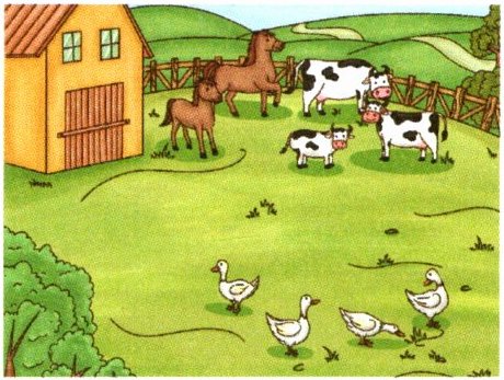 Hello, I’m Jason. Welcome to my farm. Look! These are white sheep. They’re cute. I have twenty sheep. Look at those animals over there. They’re horses. They can run fast. There are fifteen horses on my farm. Can you see four cows under the tree? They’re big. Look! Those are hens and ducks. I have a lot of hens and ducks.