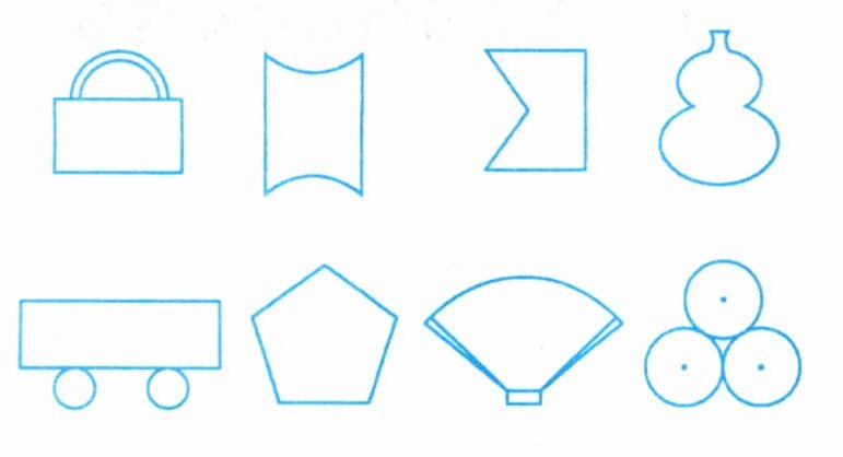 本题可根据对称轴的定义,通过观察图形的对称性来画出对称轴。对称轴是指使几何图形沿着某条直线对折后,直线两侧的部分能够完全重合的直线。对于第一个类似手提包的图形,它是左右对称的,对称轴是过图形中间的一条竖直直线。第二个类似弯曲四边形的图形,它是左右对称的,对称轴是过图形中间的一条竖直直线。第三个图形不是轴对称图形,没有对称轴。第四个葫芦形状的图形,它是左右对称的,对称轴是过图形中间的一条竖直直线。第五个类似小车的图形,它是左右对称的,对称轴是过图形中间的一条竖直直线。第六个正五边形,它有5条对称轴,分别是过每个顶点与对边中点的直线。第七个扇形,它的对称轴是过扇形圆心和弧中点的一条直线。第八个由三个圆组成的图形,它是左右对称的,对称轴是过上面圆的圆心且垂直于下面两个圆连心线的直线。综上,按照上述分析画出各图形的对称轴(第三个图形除外)。