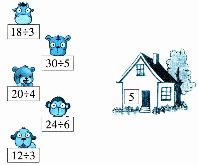 本题可先分别计算出每个除法算式的结果,再与房子上的数字$5$进行连线。