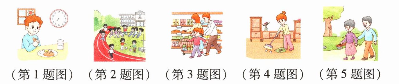1. eat/have breakfast 2. play sports 3. go shopping 4. clean 5. go for a walk