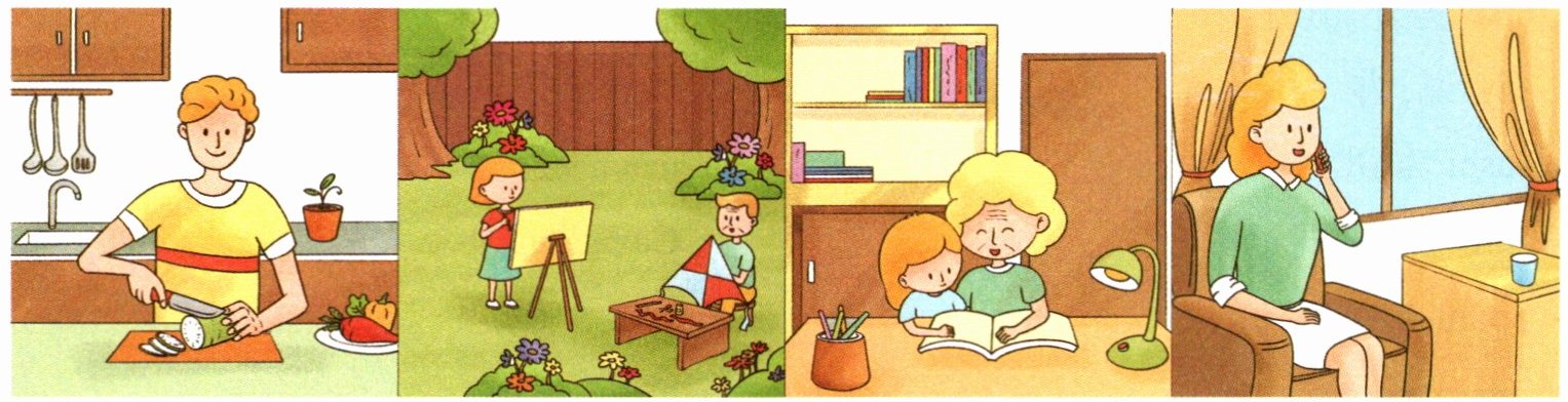 Today is Family Day. Look! Sue's father is cooking in the kitchen. Sue is drawing a picture in the yard. Sue's grandpa is making a kite for the girls. Sue's grandma is reading stories to Sue's sister. Sue's mother is talking on the phone in the living room. They are having a good time.