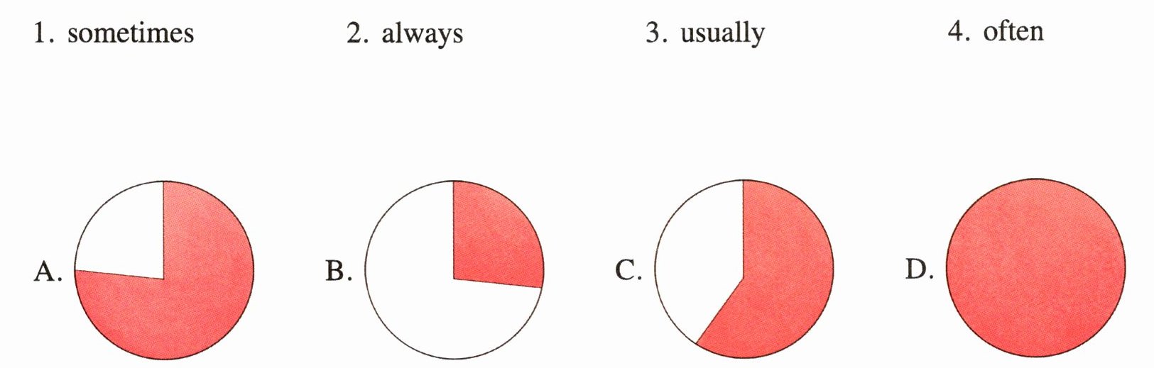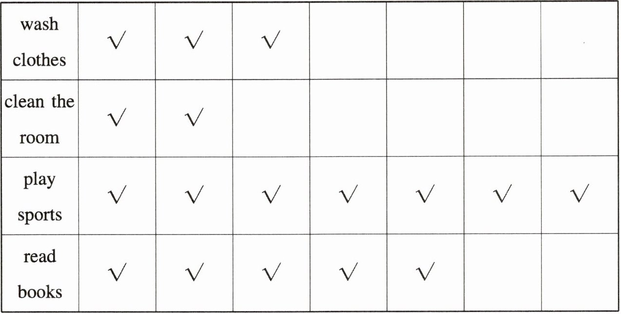 二、下面是李明的周末活动频率表,根据表格信息,选择合适的频度副词填空。(“√”的多少表示频率的高低)
