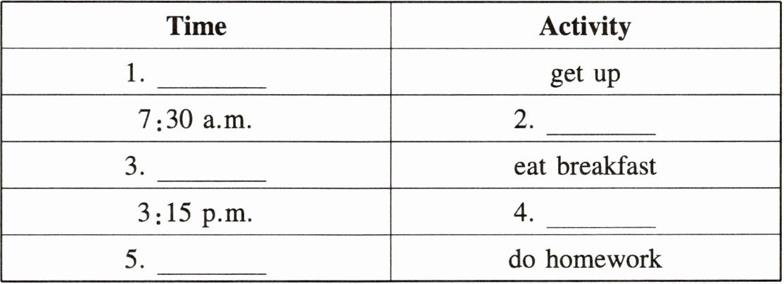 E. 8:00 a.m. F. play sports G. 8:45 p.m.