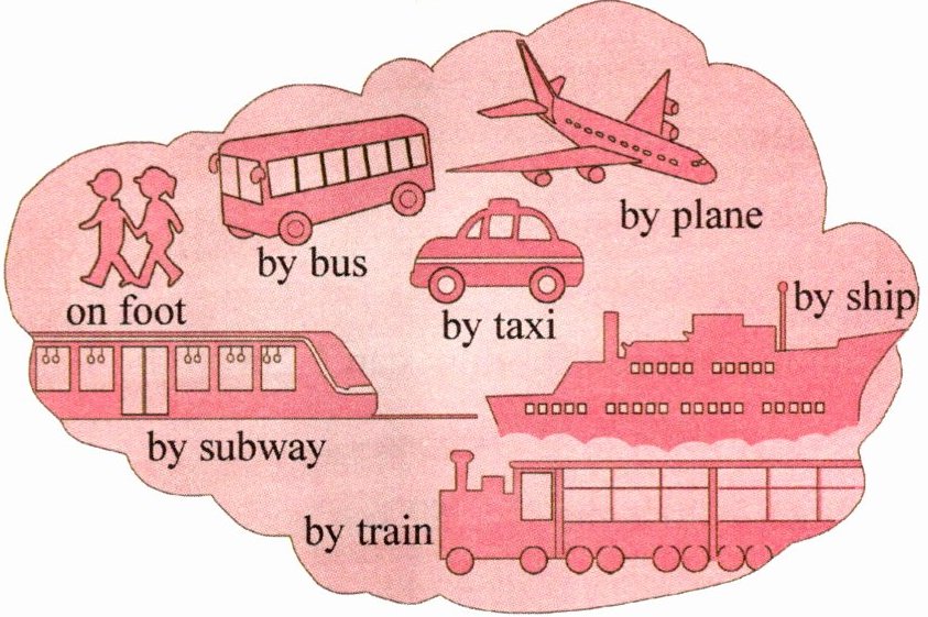 1. on foot 2. by plane 3. by taxi 4. by bus 5. by train