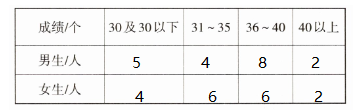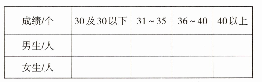 1. 对于完成统计表,需要分别对男生和女生的成绩按照不同的成绩范围进行分类统计。对于男生成绩,逐一判断每个成绩属于哪个范围,统计出每个范围的人数。24、28、29、30、31属于30及30以下,有5人;32、33、35、35属于31 - 35,有4人;36、37、38、38、39、39、40、40属于36 - 40,有8人;41、42属于40以上,有2人。对于女生成绩,23、26、28、29属于30及30以下,有4人;30、31、32、32、33、33属于31 - 35,有6人;34、35、35、36、37、38属于36 - 40,有6人;40、41属于40以上,有2人。