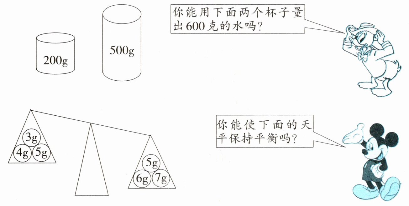 - 能量出$600$克的水,方法为先装满$500$克杯子,倒满$200$克杯子,将$200$克水倒掉,把$500$克杯子剩余$300$克水倒入$200$克杯子,再装满$500$克杯子,此时两部分水共$600$克(或$500\times2 - 200\times2=600$的操作方式)。