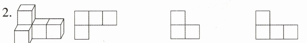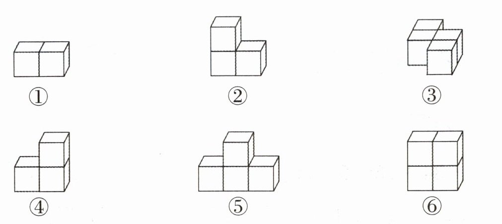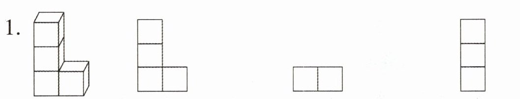三、搭一搭,看一看,在从前面看到的形状下画“√”,在从上面看到的形状下画“○”,在从左面看到的形状下画“△”。
