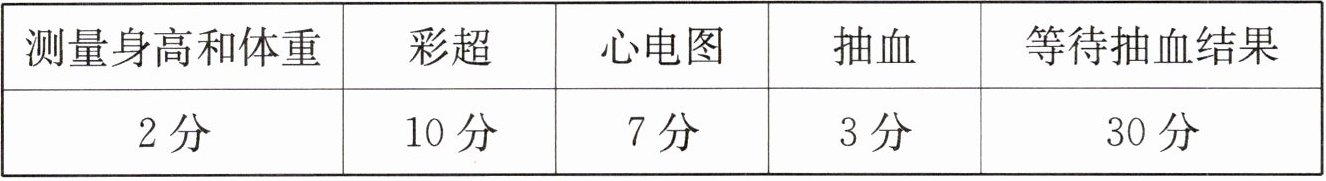 答:先抽血,再测量身高和体重、做彩超、做心电图(测量身高和体重、做彩超、做心电图的顺序不唯一),最后等待抽血结果,这样安排所用的时间最短。最短用时33分。
