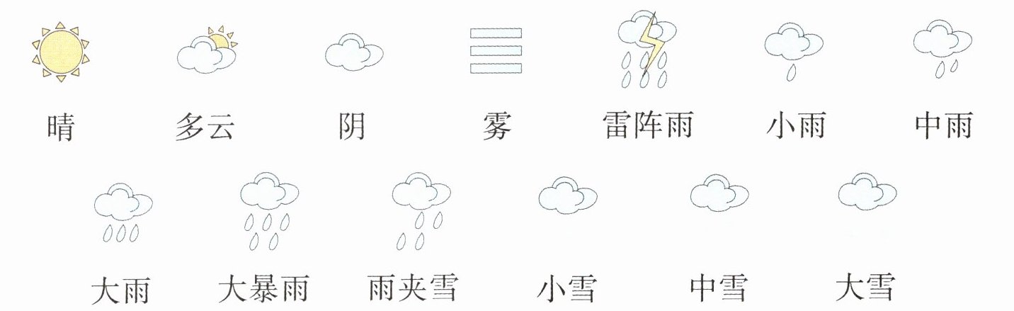 同学们,我们在电视或手机上看天气预报时,会看到许多不同的天气符号,你知道这些符号分别代表什么含义吗?让我们一起了解一下吧!