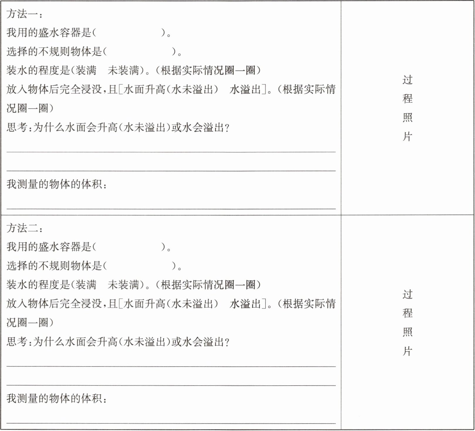 水未装满且未溢出:$V_{不规则物体}=V_{放入物体后水和物体的总体积}-V_{放入物体前水的体积}$