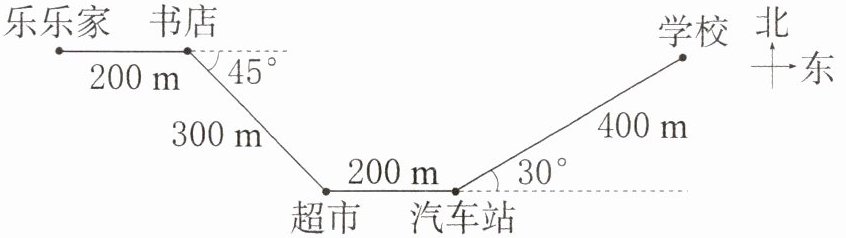乐乐从家出发,先向东走200m到书店,再向东偏南45°方向走300m到超市,接着向东走200m到汽车站,最后向东偏北30°方向走400m到学校。